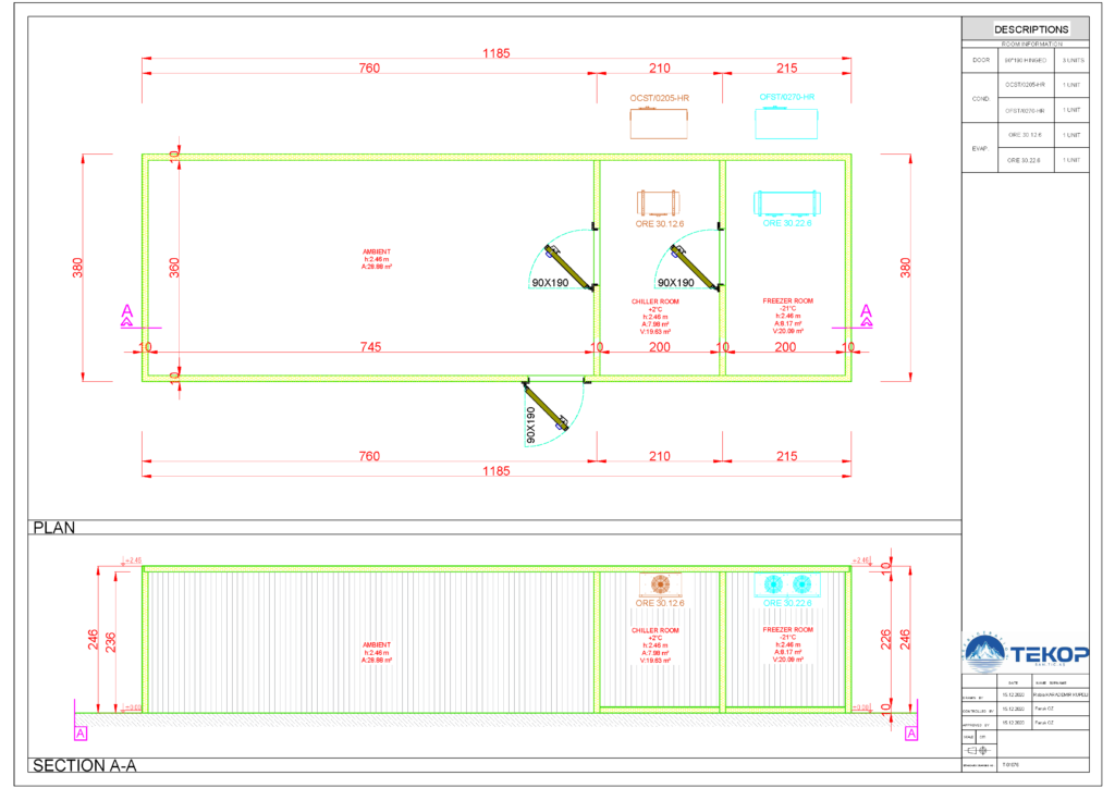 20 m³ capacity 1 pc. Freezer Room (-21 °C) 20 m³ capacity 1 pc. Freezer Room (-21 °C) 20 m³ capacity 1 pc. Freezer Room (-21 °C) 20 m³ capacity 1 pc. Freezer Room (-21 °C) 1 x Chiller Room , 1 x Freezer Room , 1 x Ambient Room General Cold Storage 45 m² Split Refrigeration System 3 x Cold Room Hinged Door 185,2 m² 7,98 m² 2,46 m +2 °C 20 m³ 8,17 m² 2,46 m -21 °C 19 m³ 28,88 m² 2,46 m – 71 m³ Future Projects
